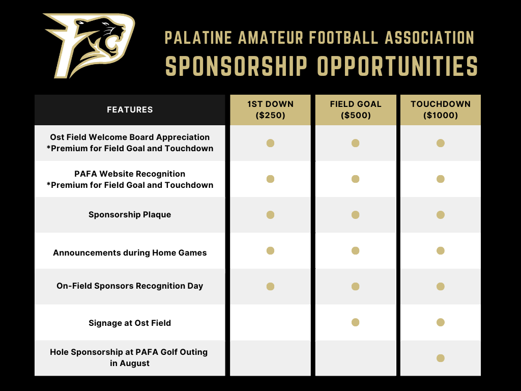 The success of the Palatine Amateur Football Association is possible due to our amazing community business leaders and families who provide sponsorship support. Running a successful, fully volunteer football program is only possible with leaders like yourself who help make the program one of the best in the Chicagoland area. Please take some time to review the sponsorship information.