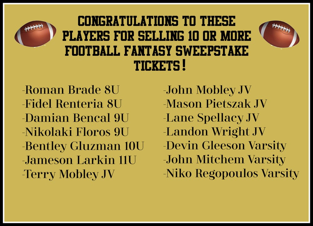 Congratulations to our top sellers - selling 10 or more tickets for the Football Fantasy Sweepstakes Fundraiser! Thanks for helping to support PAFA Football!